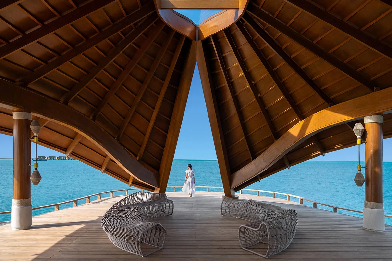Sunset Social is a vibrant overwater retreat where refined Maldivian atoll cuisine and exotic tropical cocktails complement panoramic sea views and the warm hues of the setting sun, while unique catamaran net seating offers an unparalleled vantage point for observing the enchanting marine life below.