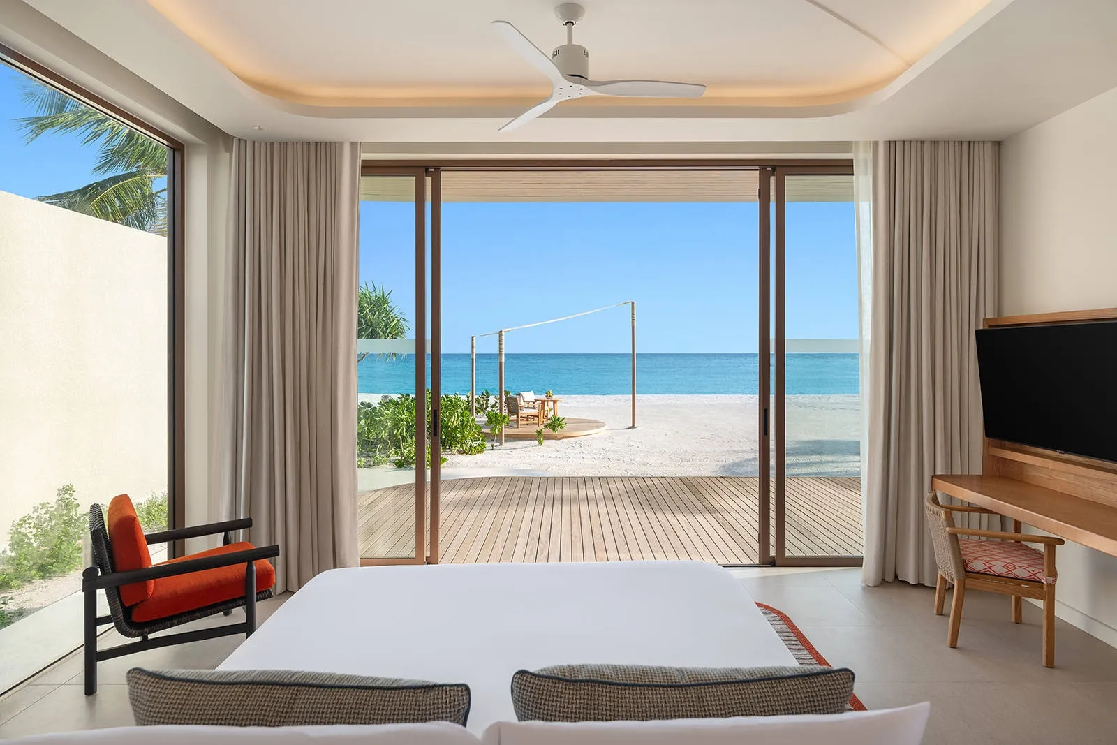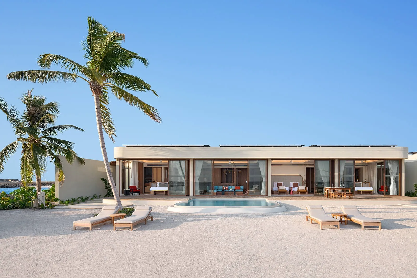 Experience sophisticated living in the Three-Bedroom Sunset Beach Pool Residence, a stunning 260 sqm residence designed for families or larger groups with a private outdoor deck and swimming pool and direct beach access. Accommodating up to 7 adults, guests will enjoy the modern comforts of three spacious bedrooms, contemporary bathrooms, a separate living and dining area, kitchenette, flat-screen TVs and more.