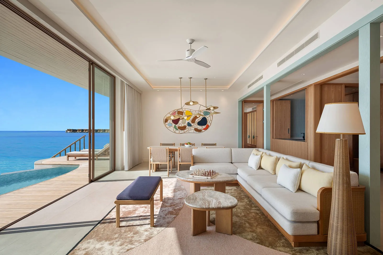 Revel in panoramic ocean views from the Grand Two-Bedroom Overwater Pool Villa, offering 166 sqm of peaceful living space, a private pool for leisurely dips, modern bathrooms, and direct access to the lagoon for a refreshing swim in the crystal-clear waters. Ideal for families or groups seeking to embrace the natural beauty of the Maldives, this villa sleeps up to 5 adults or 4 adults and 1 child.