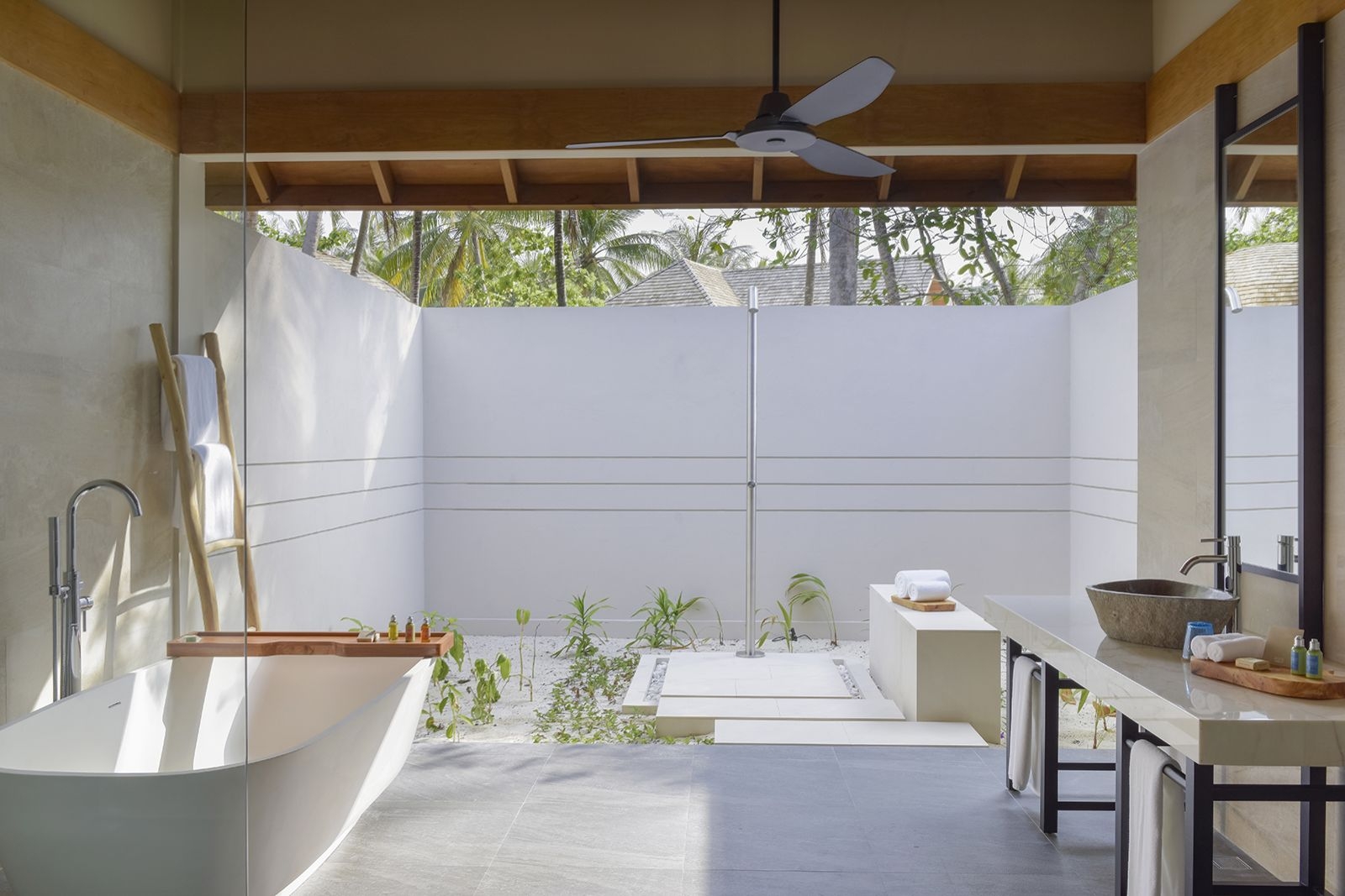 The Beach Villas feature an open-air bathroom and private furnished patio. Indulgently understated architecture with clean lines, muted wood tones and soft pastel accents. Access to a shaded timber deck framed by foliage and are also overlooking the sea.