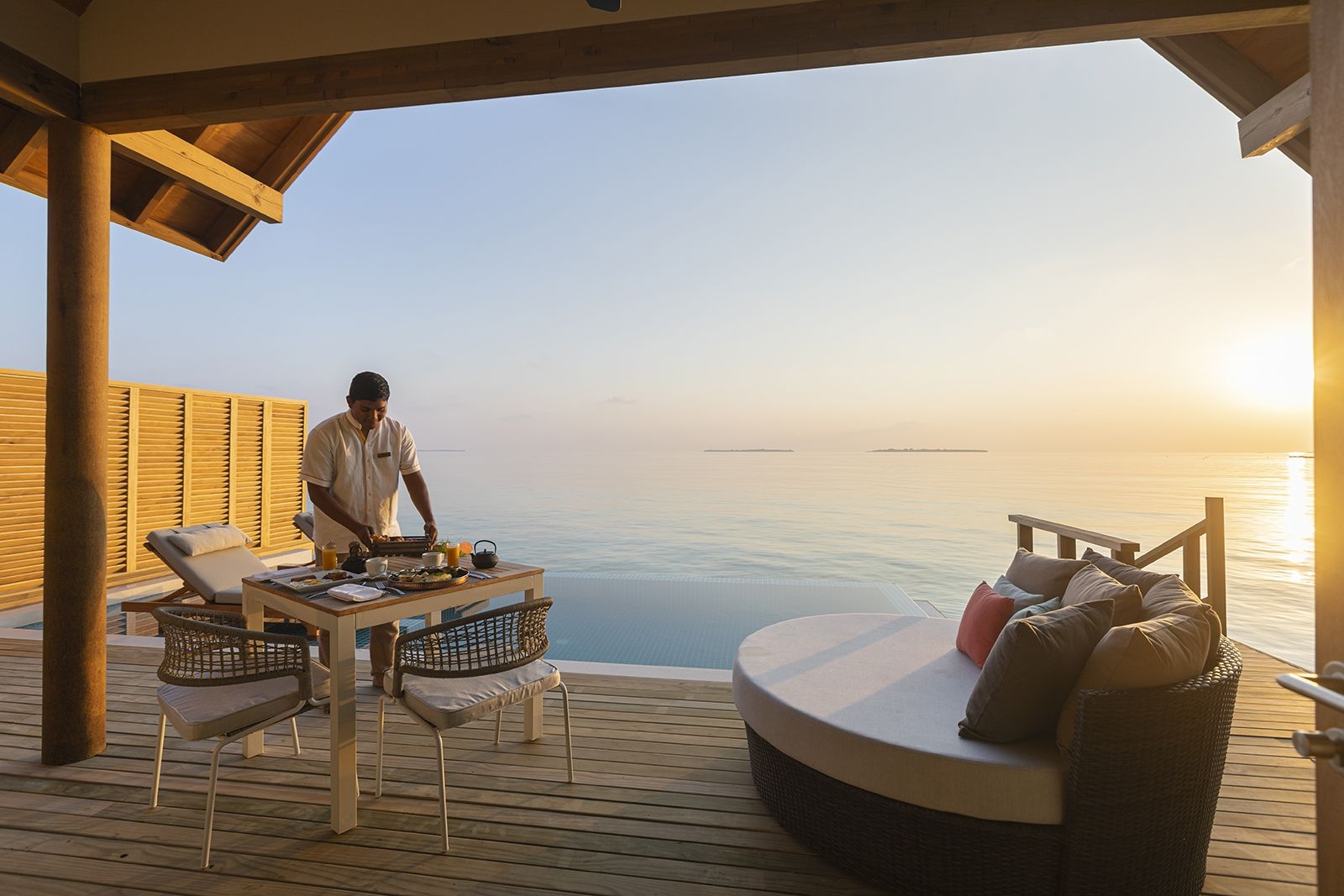 The Superior Water Villas with Pool are at the far tip of the jetty and with direct lagoon access; there are only a few of these overwater villas. Expansive wood floors; adjoining deck with a private infinity pool. Wide views over turquoise seas. They also feature a private infinity pool, in-room dining space, walk-in closet, AC bathroom, snorkeling gear and IDD cordless telephone.
