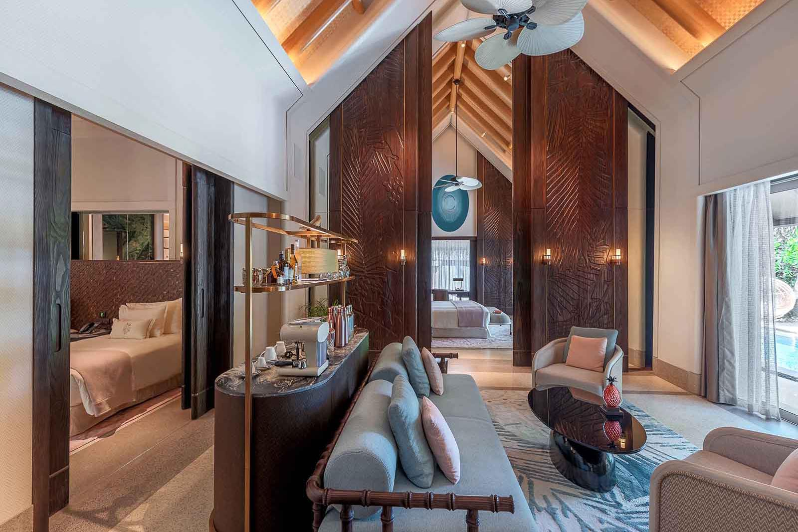Your infinity pool overlooks the Indian Ocean, while a private library offers a dreamy reading experience. Enjoy round-the-clock service, with a Jadugar room on the premises and a buggy and driver at your disposal for island excursions.