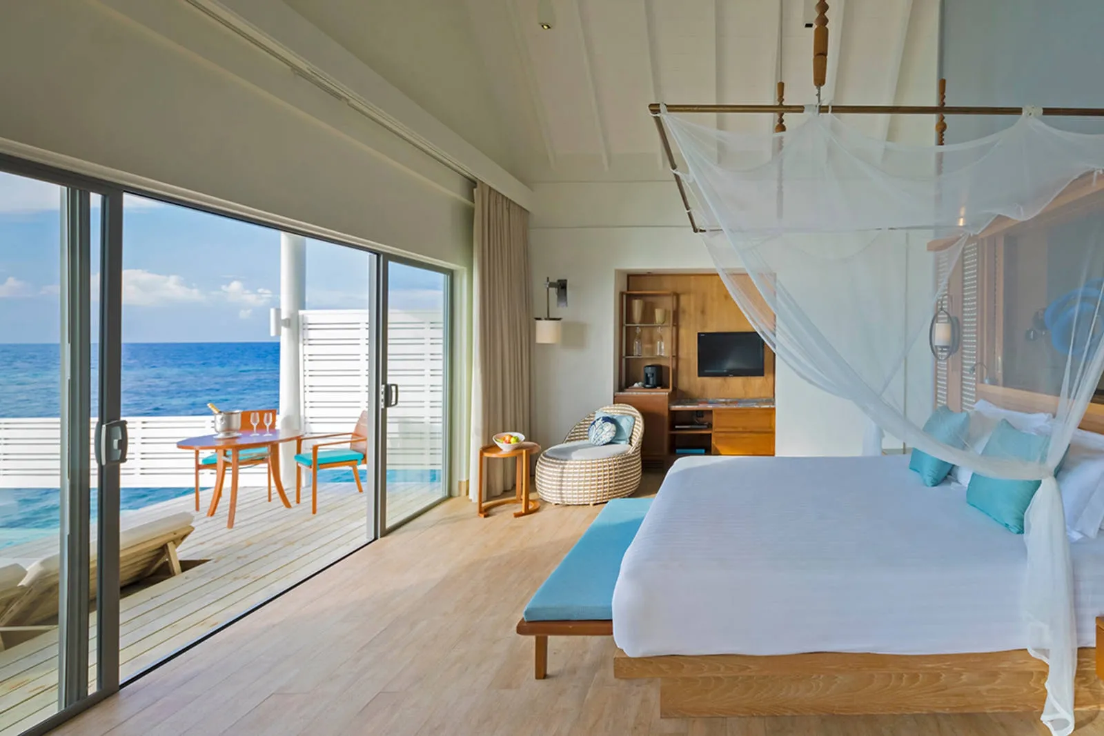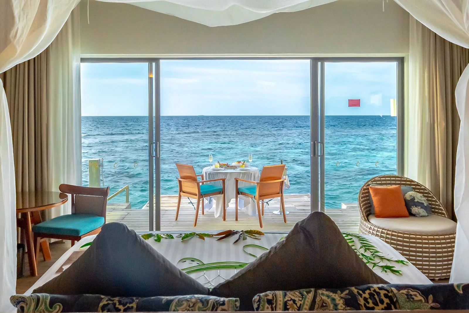 Surround yourself in brilliant blues in an overwater villa, where you can wake up to stunning sunsets over the horizon. Adorned with fresh, all-white interior design with pops of bright tropical hues, the 86-sqm living space features a private sundeck that gives you direct access to the warm, azure lagoon.