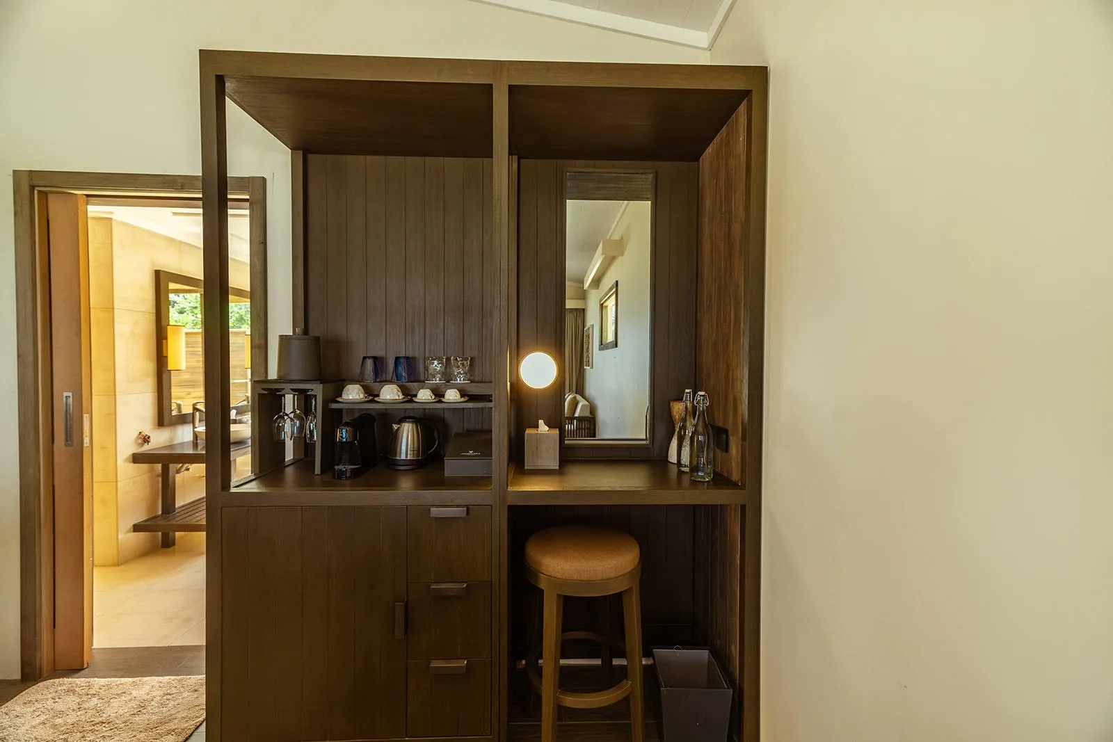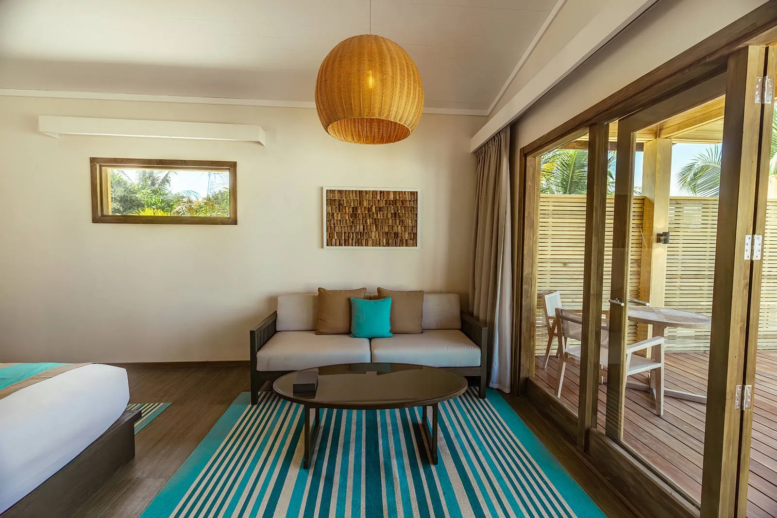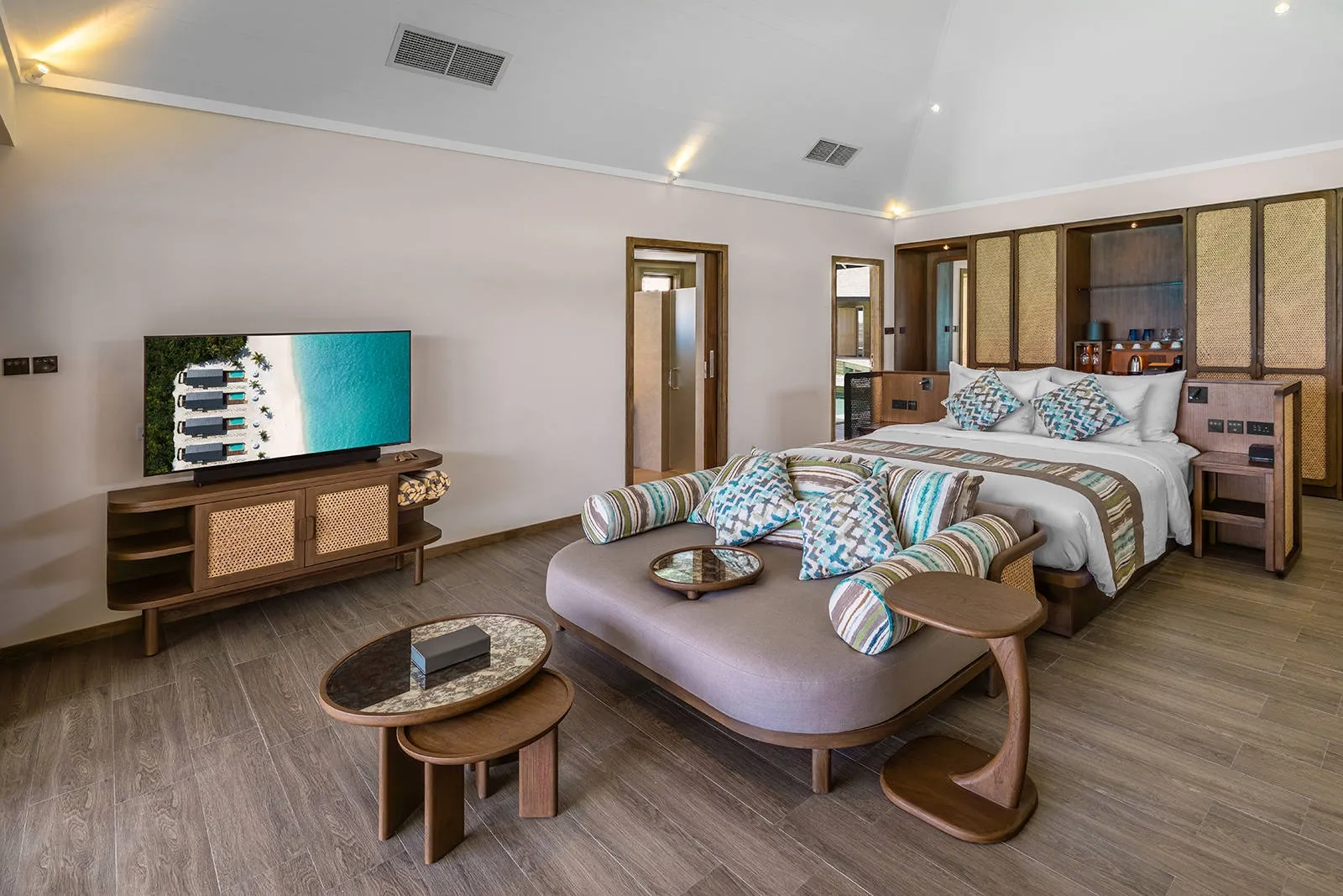 Each features expansive ocean views and private balconies to greet the morning sun over tranquil waters, paired with modern interiors blending comfort and natural elegance. Inside, enjoy king-sized beds, a fully equipped kitchenette, spacious living area with plush seating, and en-suite bathrooms with rain showers. Step outside to your personal terrace for sunbathing, a private breakfast, or simply listening to waves lap the shore.