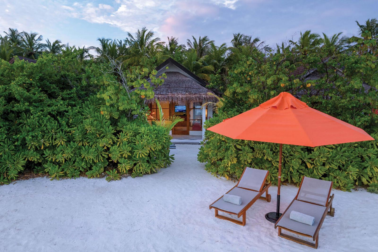 Vibrant and tropical, these stand-alone Maldives beach villas face the beautiful turquoise lagoons of Sangeli island. Each with a high-ceilinged bedroom, a walk-in wardrobe, and a partially open-air Maldivian bathroom. Accentuating trendy design styles fused with traditional Maldivian architecture create a warm, inviting space. Step out to the large terrace leading to a private garden and beach.