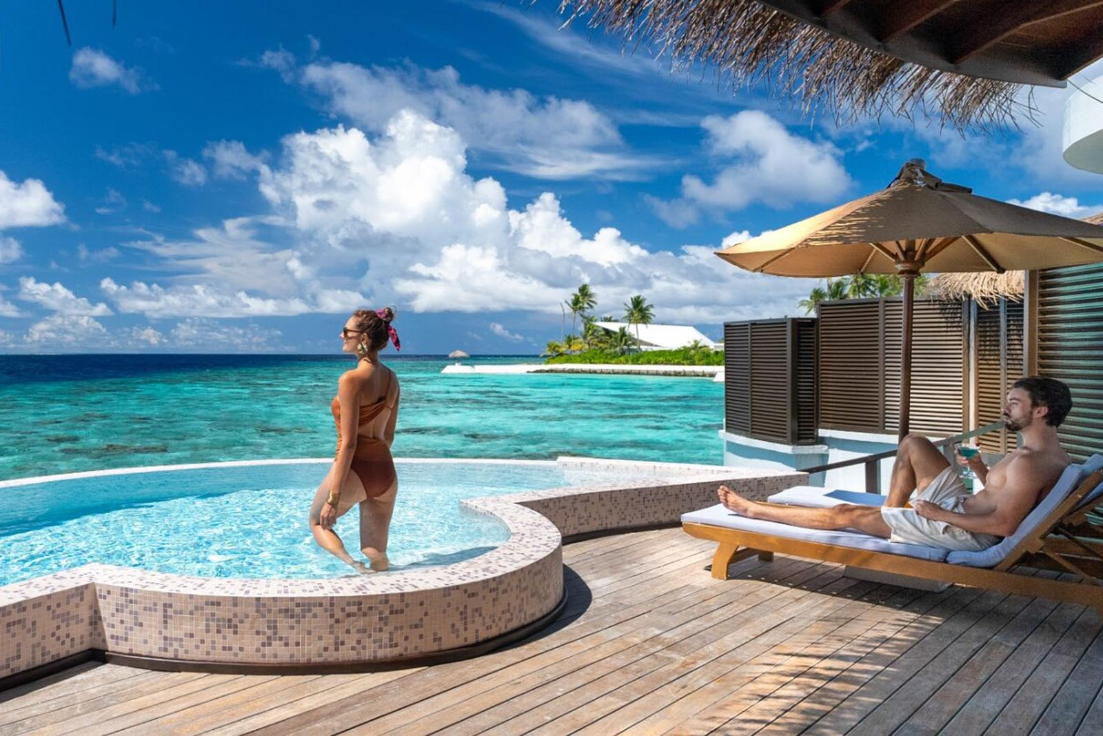 Refresh your senses in a stunning water villa with pool in Maldives featuring a contemporary design with tropical highlights. Luxurious bedroom with floor-to-ceiling glass panel windows, plush bathroom, scenic bathtub, and an outdoor deck with a stunning 8 mΒ² infinity pool enhance the charm of lagoon living.