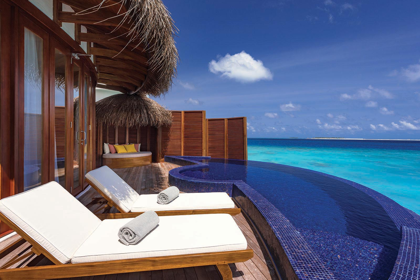 Your overwater sanctuary features plush amenities, from an ocean view bathtub to a comfy master bed. The mini-bar is replenished daily with alcoholic and non-alcoholic beverages along with a selection of snacks. An overwater sun deck with an outdoor bed and sun loungers make it easy to soak in the Indian Ocean vistas.