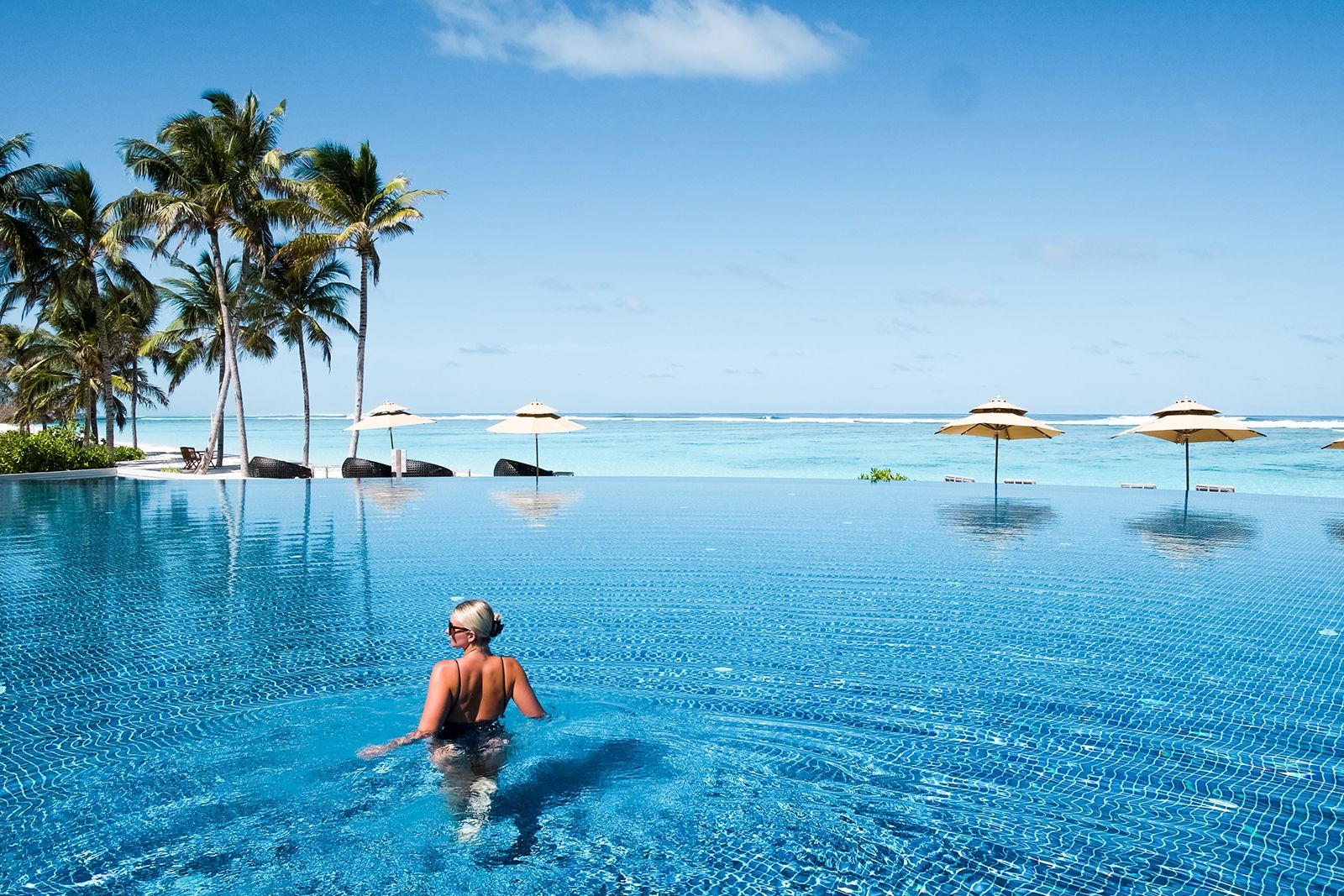 Make the most of your island getaway in our Three Bedroom Beach Villa - Pool and Sunset View. Appreciate stunning vistas, a private infinity pool, and convenient beach access. Enjoy the extra space of three separate bedrooms, and twin vanity counters. All standard amenities such as a spacious outdoor deck with lounge chairs are also included.