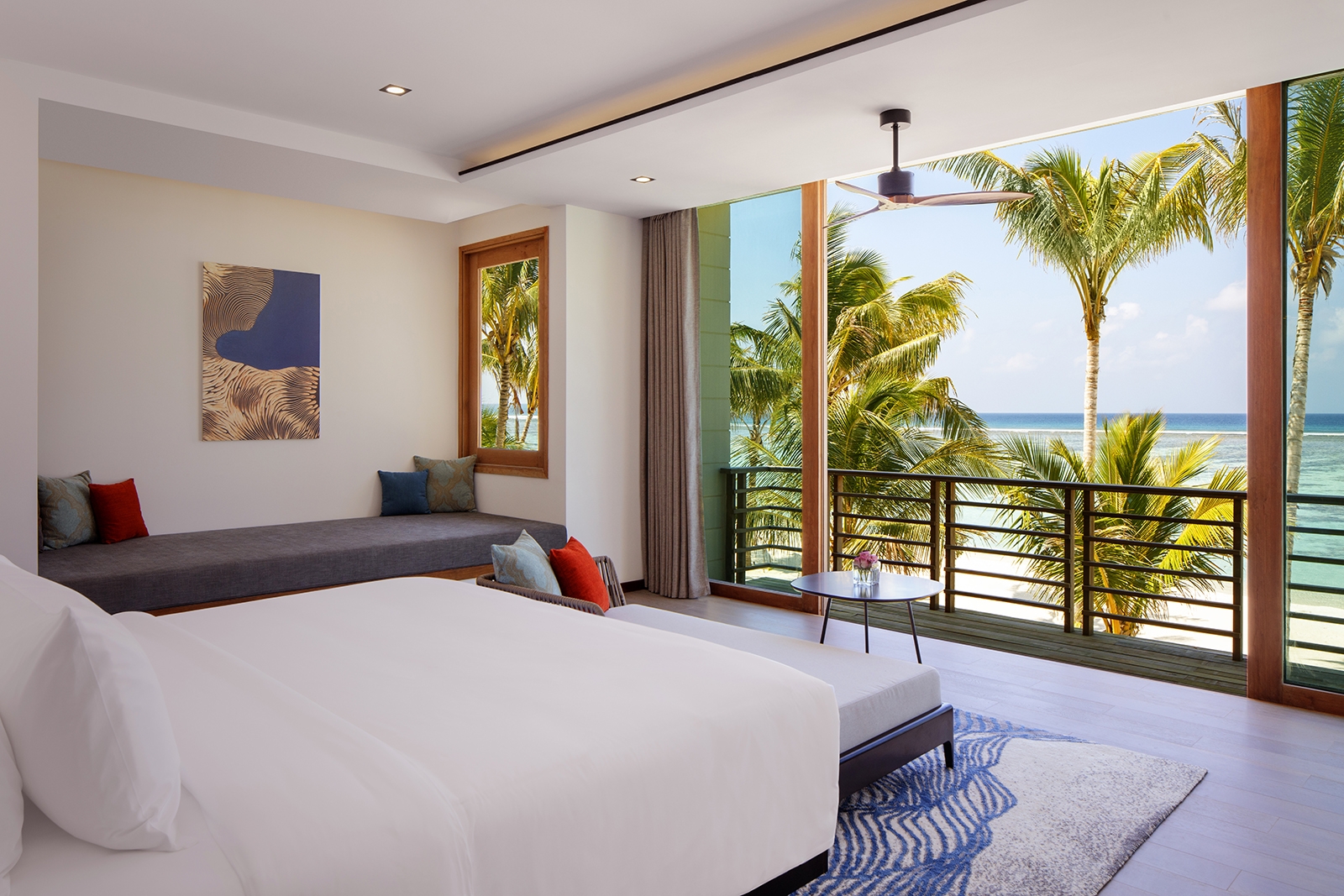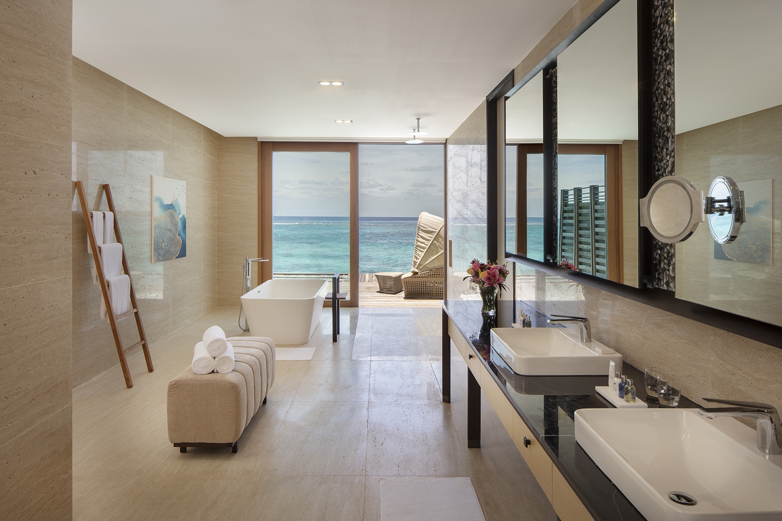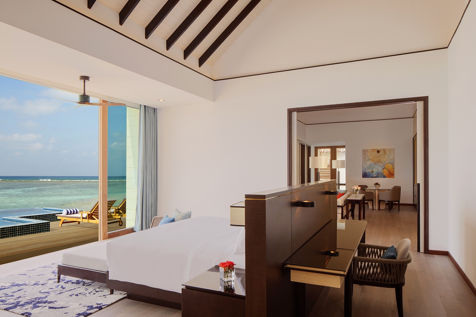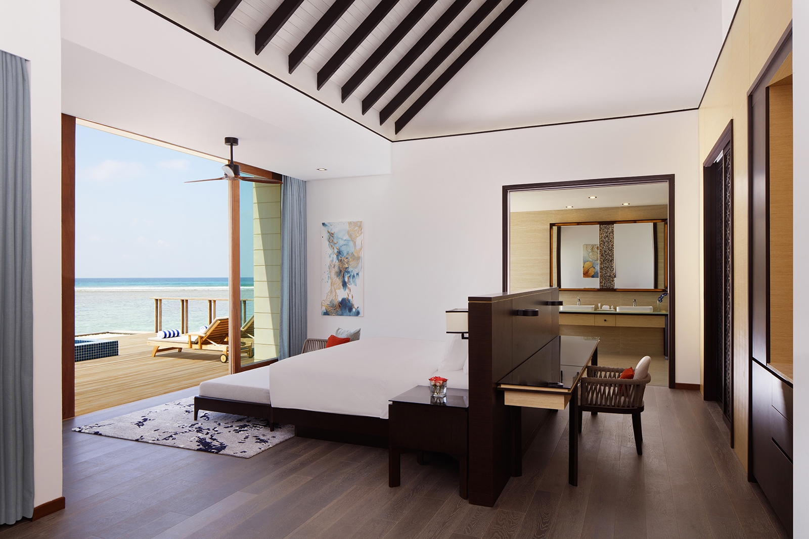 Our Overwater Villa helps you embrace island life with stunning views, unforgettable sunrises over the Indian Ocean, a large deck with private pool, and easy access to the pristine ocean waters. Sunbathe in a lounge chair or enjoy a break from the sun while tuning in to your favorite show on the smart TV. Additional in-room amenities include a walk-in wardrobe, a bathtub with panoramic views, a rain shower, twin vanity counters, and a coffee machine.