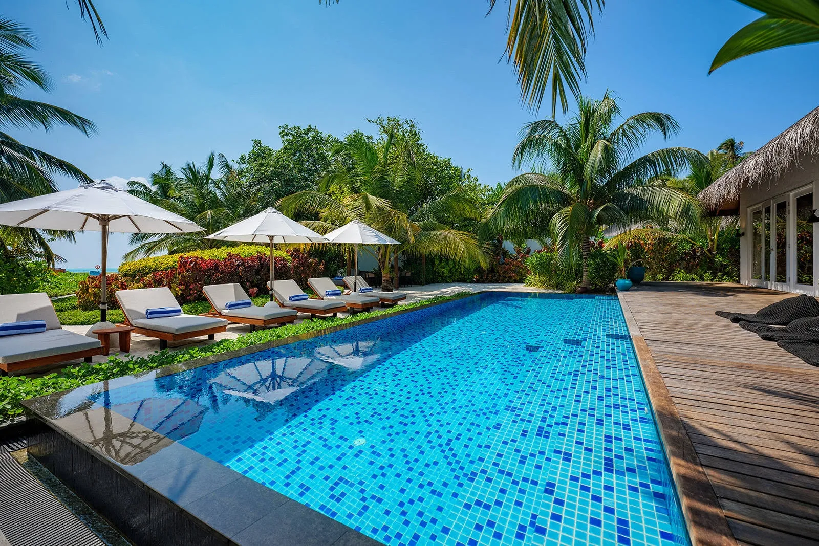 Soak up the spectacular tropical scenery of the Maldives in our Two Bedroom Sunrise Water Villa.